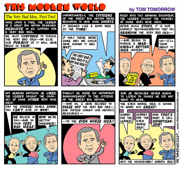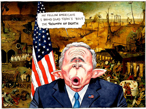 JON CARROLL’S AMAZING PASSPORT ESCAPADES WATCH: STATE OF THE SATIRE SPEECH http://www.crooksandliars.com/2007/01/23/open-thread-378 OLBERMANN: STATE-BY-STATE OF THE UNION REVIEW (or should that be “revue?”) http://www.crooksandliars.com/2007/01/24/olbermann-a-look-back-at-bushs-sotu-credibility/ IT’S TOM ‘CHRIST’ CRUISE http://www.thesun.co.uk/article/0,,4-2007030603,00.html BLAIR SIGHTING CONFIRMED AFTER CATS DISAPPEAR http://www.thespoof.com/news/spoof.cfm?headline=s1i14062 And on to the state of the news and comment. . . EPA CLOSES ITS LIBRARIES, DESTROYS DOCUMENTS http://ucsaction.org/campaign/1_17_07epalibraryclosures The Environmental Protection Agency (EPA) has begun closing its nationwide network of scientific libraries, effectively preventing EPA scientists and the public from accessing vast amounts of data and information on issues from toxicology to pollution. The Little Dictator BUSH’S 20 PERCENT GAS REDUCTION IS HOT AIR That’s off projected use, not actual use! http://thinkprogress.org/2007/01/24/thinkfast-january-24-2007/ WHAT? NO MENTION OF MARS OR NEW ORLEANS? Might as well be the same place, as far as Bush is concerned http://news.yahoo.com/s/ap/20070124/ap_on_go_pr_wh/state_of_union_katrina WATCH: ANNOTATED STATE OF THE UNION ADDRESS Read the facts as Bush delivers the fairy tales http://thinkprogress.org/2007/01/24/annotated-sotu/ REPUGNICANS BEAT UP ON BUSH AFTER SPEECH http://abcnews.go.com/Politics/print?id=2818145 THOMPSON: ANOTHER MISSION UNACCOMPLISHED http://www.capitolhillblue.com/news2/2007/01/another_mission.html As speeches go, his State of the Union address was better than some of his previous efforts - devoid of the multiple verbal gaffes that have marred his Presidency.But if motivation of a nation weary of war and skeptical of his policies, lies and missteps was Bush's goal, he can mark this one up as just another failure in a Presidency of missions unaccomplished. ALL TALK, NO PLAN http://www.capitolhillblue.com/news2/2007/01/reaction_to_spe.html PROPOSALS THAT WILL GO NOWHERE http://www.alternet.org/story/47090/ FULL STATE OF UNION GUEST LIST http://seattlepi.nwsource.com/national/1151AP_State_of_Union_Guests.html Democraps WEBB WAS SUCCINCT, COGENT http://www.thenation.com/blogs/notion?pid=159940 WATCH: WEBB’S EXCELLENT RESPONSE http://thinkprogress.org/2007/01/23/webb-sotu/ Iran from the Truth ARAB LEAGUE HEAD: DON’T ATTACK IRAN http://www.alertnet.org/thenews/newsdesk/L24925722.htm BY THE WAY, WE’RE BOMBING SOMALIA AGAIN http://rawstory.com/news/2007/US_launches_second_airstrikes_on_So_01242007.html Anti-Carterism ‘THIS IS HURTING ME’---JIMMY CARTER http://www.time.com/time/quotes CARTER STANDS BY HIS (TRUTHFUL, REALISTIC, SANE) BOOK http://www.iht.com/articles/2007/01/24/news/carter.php ISRAEL INSIDER LIKENS CARTER TO. . .DAVID DUKE! Quick, cue the tweety-birds! http://web.israelinsider.com/Views/10455.htm CARTER BACKS DOWN OVER (REASONABLE) SENTENCE IN BOOK http://bbsnews.net/article.php/2007012401515949 CARTER’S ‘PEACE MISSION’ TO BRANDEIS http://www.washingtonpost.com/wp-dyn/content/article/2007/01/23/AR2007012301668.html Electile Dysfunction JON CARROLL: NARCISSISTS FOR PRESIDENT! http://sfgate.com/cgi-bin/article.cgi?f=/c/a/2007/01/24/DDGRJN7IN71.DTL So we get only candidates who are certified narcissists. It's not a matter of public service anymore -- the itch to serve the public can be scratched in any number of ways that leave a person time to be a person. It's the urge to power, the love of combat, the high of being the Decider. Being president is the only job where wanting it should result in immediate disqualification. I liked Barack Obama a lot better before he decided to run for president. GIULIANI ASKED: WHAT IN HELL DOES A MAYOR KNOW ABOUT IRAQ? Biggest zero to run for prez since. . .Bush http://www.rawstory.com/news/2007/Giuliani_stumbles_at_What_does_mayor_0124.html WHY THE HATE FOR HILLARY? http://www.alternet.org/story/46237/ The details of her life are familiar enough; perhaps that's why all the profiles of her over the last 10 years have always seemed tedious and repetitive. It's how we shape those facts that's interesting. Hillary herself once said she had become some kind of Rorschach blot in which Americans see many things. Mashed Media HAHAHA---PHILLY INQUIRER INTRODUCES ‘EXPRESS’ SECTION Real short stories for people with real short attention spans http://www.editorandpublisher.com/eandp/news/article_display.jsp?vnu_content_id=1003536650 MASS MURDOCH: RUPERT GOES AFTER TRIBUNE COMPANY http://www.editorandpublisher.com/eandp/news/article_display.jsp?vnu_content_id=1003536510 CHRIS CUOMO ALMOST WIPED OUT IN IRAQ http://www.editorandpublisher.com/eandp/news/article_display.jsp?vnu_content_id=1003536702 Enviro Wacko STRICKEN CARGO SHIP ABOUT TO POISON BRITISH COAST WITH OIL http://news.nationalgeographic.com/news/2007/01/070123-britain-oil.html GORE FILM BANNED BY WASHINGTON SCHOOL DISTRICT http://www.progressivemajority.org/blog/?storyId=3097 Gore 'Thrilled' by Oscar Nominations http://film.guardian.co.uk/apnews/story/0,,-6367303,00.html ALL SCOTTISH SCHOOLS TO SEE GORE FILM http://www.theherald.co.uk/news/news/display.var.1126957.0.0.php THE TOP TEN CELEB PRIVATE JET OFFENDERS http://environment.guardian.co.uk/travel/story/0,,1996893,00.html Animals in the news! JAPANESE PET OWNERS TURN TO ACUPUNCTURE TO HELP AGING DOGS, CATS http://mdn.mainichi-msn.co.jp/features/news/20061226p2g00m0fe034000c.html ASTOUNDING RARE SHARK CAUGHT ON FILM http://www.dailymail.co.uk/pages/live/articles/technology/technology.html?in_article_id=431041&in_page_id=1965 Spaced Out UH-OH. . .ANOTHER TEACHER/ASTRONAUT GOING UP THIS SUMMER http://www.enn.com/iotd2.html?id=739 Oh, by the way. . . 190 MILLION HOMELESS MIGRANTS IN THE WORLD TODAY http://www.spiegel.de/international/spiegel/0,1518,461120,00.html LIFE IN PRISON FOR CHEATING ON YOUR SPOUSE---IN MICHIGAN http://sfgate.com/cgi-bin/article.cgi?f=/c/a/2007/01/24